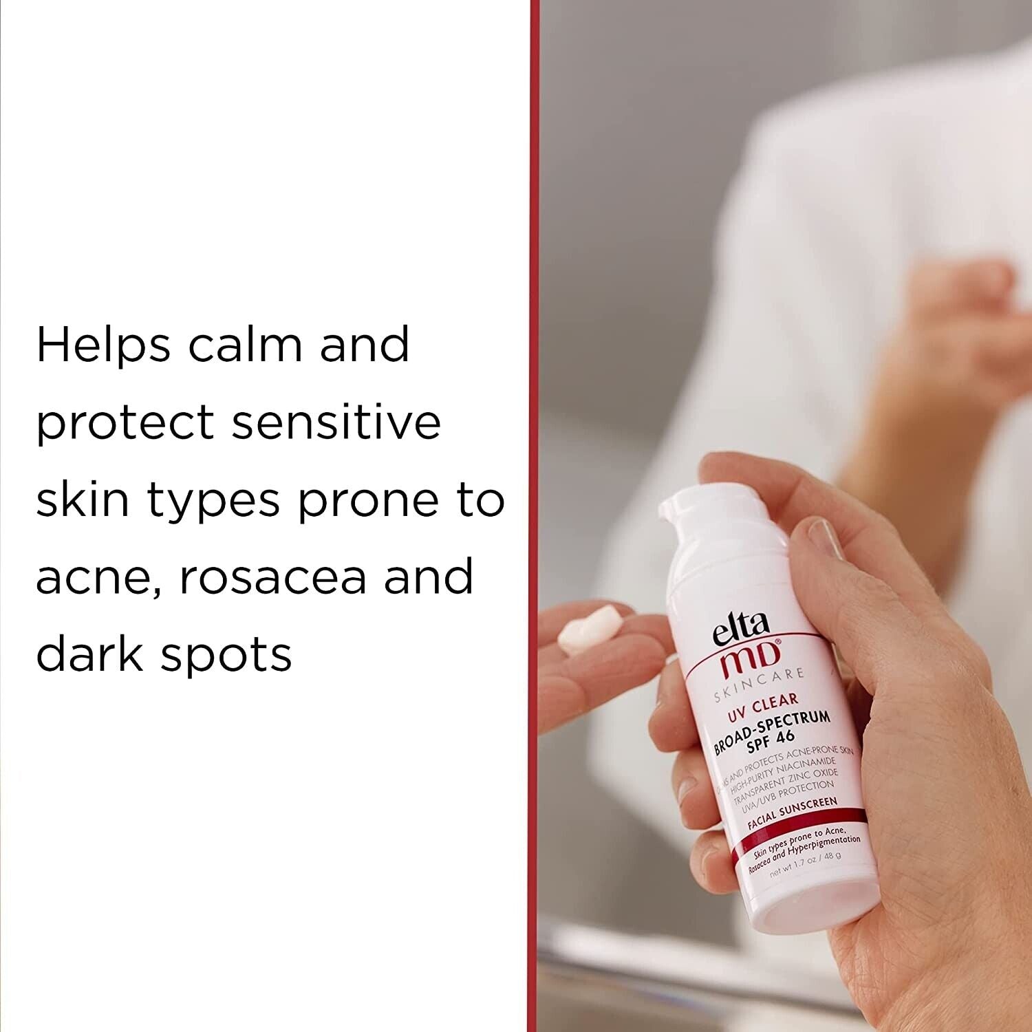 Oil-free EltaMD UV Clear helps calm and protect sensitive skin types prone to discoloration and breakouts associated with acne and rosacea. It contains niacinamide (vitamin B3), hyaluronic acid, and lactic acid, ingredients that promote the appearance of healthy-looking skin. Very lightweight and silky, it may be worn with makeup or alone. Choose from tinted and untinted formulas for use every day.